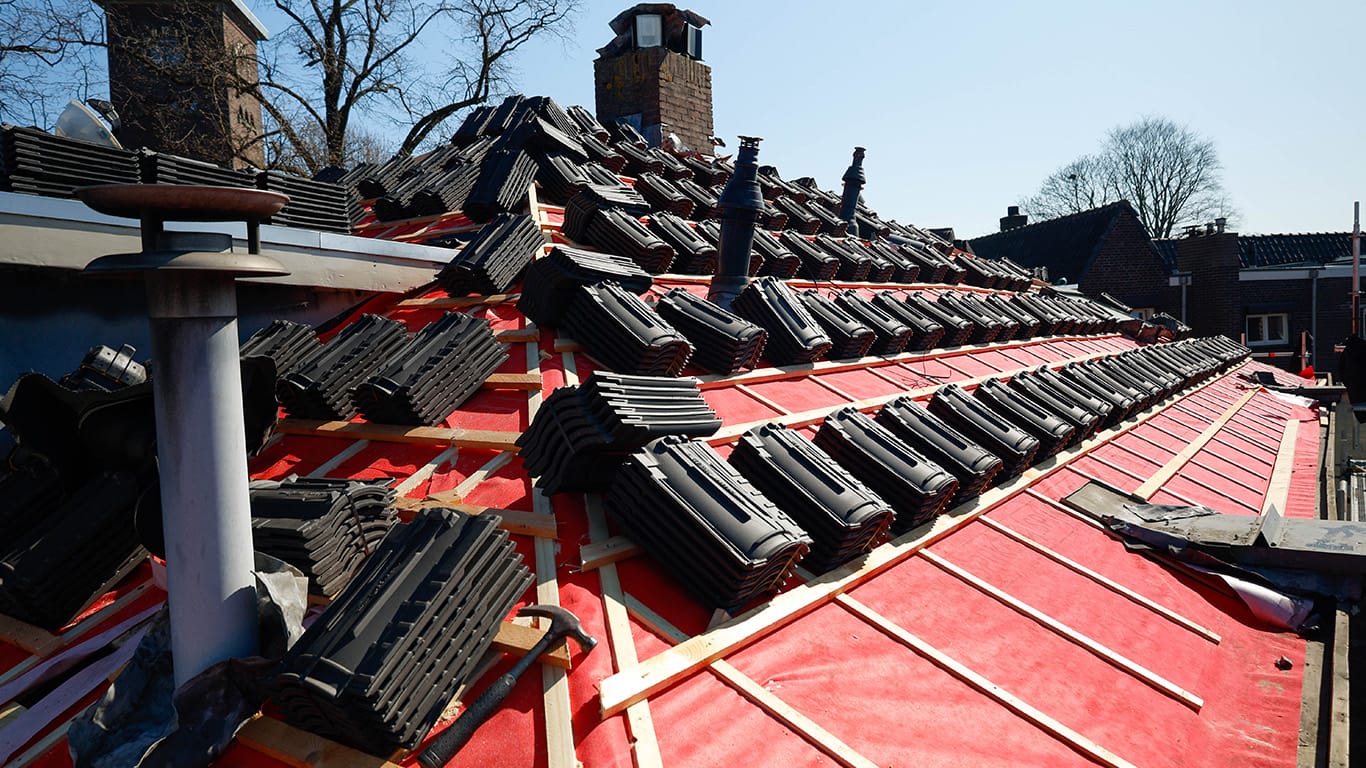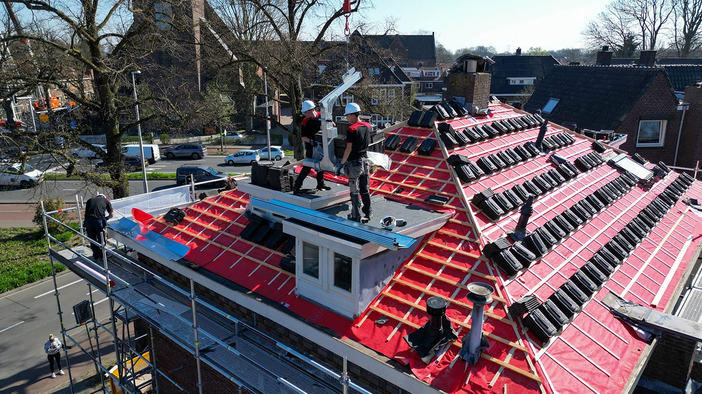 Voor een authentieke twee-onder-een-kapwoning in Tilburg schakelde een particuliere opdrachtgever Pannendekkersbedrijf Spijkers in om het pannendak te vernieuwen. Hij zocht een partij met ervaring en betrouwbaarheid – en vond die bij Spijkers. Rondom het huis plaatsten we steigers voor een veilige en efficiënte werkomgeving. We brachten een waterkerende, dampopen onderdakfolie aan, monteerden tengels en werkten het dak af met blauw gesmoorde Koramic VHV Klassiek-pannen van keramiek. De dakgoten werden vervangen door maatwerk in zink. Het resultaat: een vernieuwd dak dat naadloos aansluit bij de stijl van de woning en weer jarenlang mee kan.